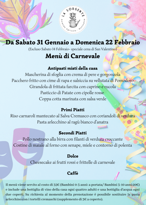 Menù Bambini: I bambini fino a 3 anni pagano solo eventuali consumazioni. I Bambini da 3 a 10 anni pagano sempre una tariffa fissa di 20€. Al momento possono scegliere se consumare i piatti del menù del giorno oppure opzionare per un menù ad hoc coposto da: antipasto, piatto di pasta, cotoletta e dolce.
